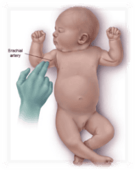 בדיקת דופק מרכזי תתבצע בזרוע (עורק ברכיאלי). | בדיקת דופק מרכזי תתבצע בצוואר (עורק קרוטיד). |