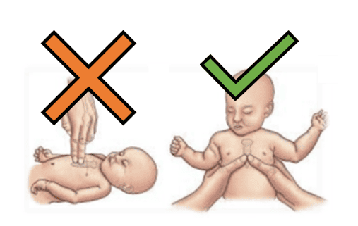 יש לבצע את ההחייאה על שולחן מוגבה, בעזרת שני אגודלים או שורש כף היד[1]. אין לבצע עיסוי אצבעות לפי הנחיות [2]AHA 2025.