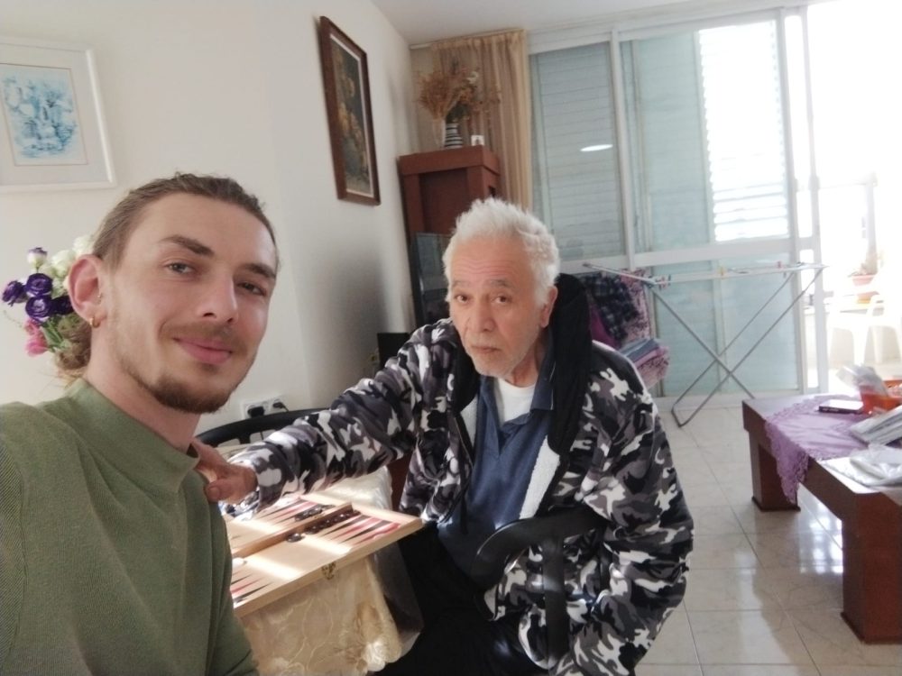 אני מבקר אזרח ותיק בשם שמעון סוויד, בן 78. אנחנו נפגשים לפחות 3-4 שעות בכל שבוע. כל אחד מאיתנו נותן משהו אחד לשני ולומד מהאדם השני. אני חושב שזה מה שהופך את הביקורים שלנו למהנים כל כך. למשל, אני עוזר לו בתרגילי הפיזיותרפיה שלו והוא נותן לי אוזן קשבת ונותן לי הזדמנות לקחת הפסקה מהלימודים. בכל הקשור לפיזיותרפיה, אני משתדל לעוזר לשמעון בתרגילים ומתיחות שונות לחיזוק ושיפור תנועתו. לשמעון יש פיזיותרפיסט שבא פעם בשבוע לעזור לו כי קשה לו ללכת. באתי במהלך אחד השיעורים שלהם כדי ללמוד את התרגילים שהוא עושה עם המטפל שלו כדי שנוכל לעשות אותם ביחד. הפיזיותרפיסט חשב שזה רעיון מצוין כי שמעון חייב להתאמן יותר מפעם בשבוע. בדרך כלל אנו עושים כ-10-20 דקות של מתיחות משולבות, תרגילי כוח, תרגילי הליכה ותנועת מפרקים בכל ביקור, תלוי איך הוא מרגיש. אני מקווה שעכשיו מזג האוויר התחמם, שנצא ביחד ונתרגל הליכה בפארק או על הטיילת, ואז נשחק שש-בש גם בחוץ.