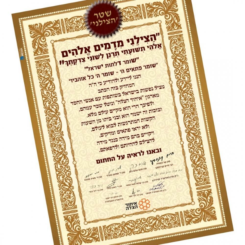 תוכלו עכשיו תוכלו לקבל ולתלות בביתכם את 'שטר הצילני' שטר התחייבות מגדולי הדור בו הם חתמו שבזכות התרומה לארגון איחוד הצלה "ישמר הוא ובני ביתו מן השעות הקשות המתרגשות לבוא לעולם. ולא יראו פתאים ומזיקים, ויקויים בהם מידה כנגד מידה להצילם להחיותם ולרפאתם."